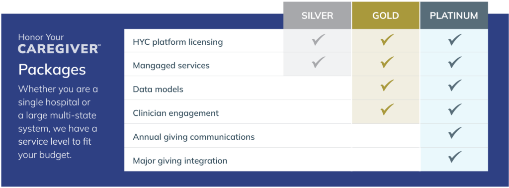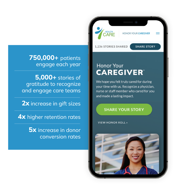 Honor Your CaregiverSM (HYC) is our flagship product and gold-standard digital grateful patient solution. With HYC, patients can express gratitude for their care teams through stories and donations to help you build a pipeline of supporters, and grow a culture of philanthropy across your organization.